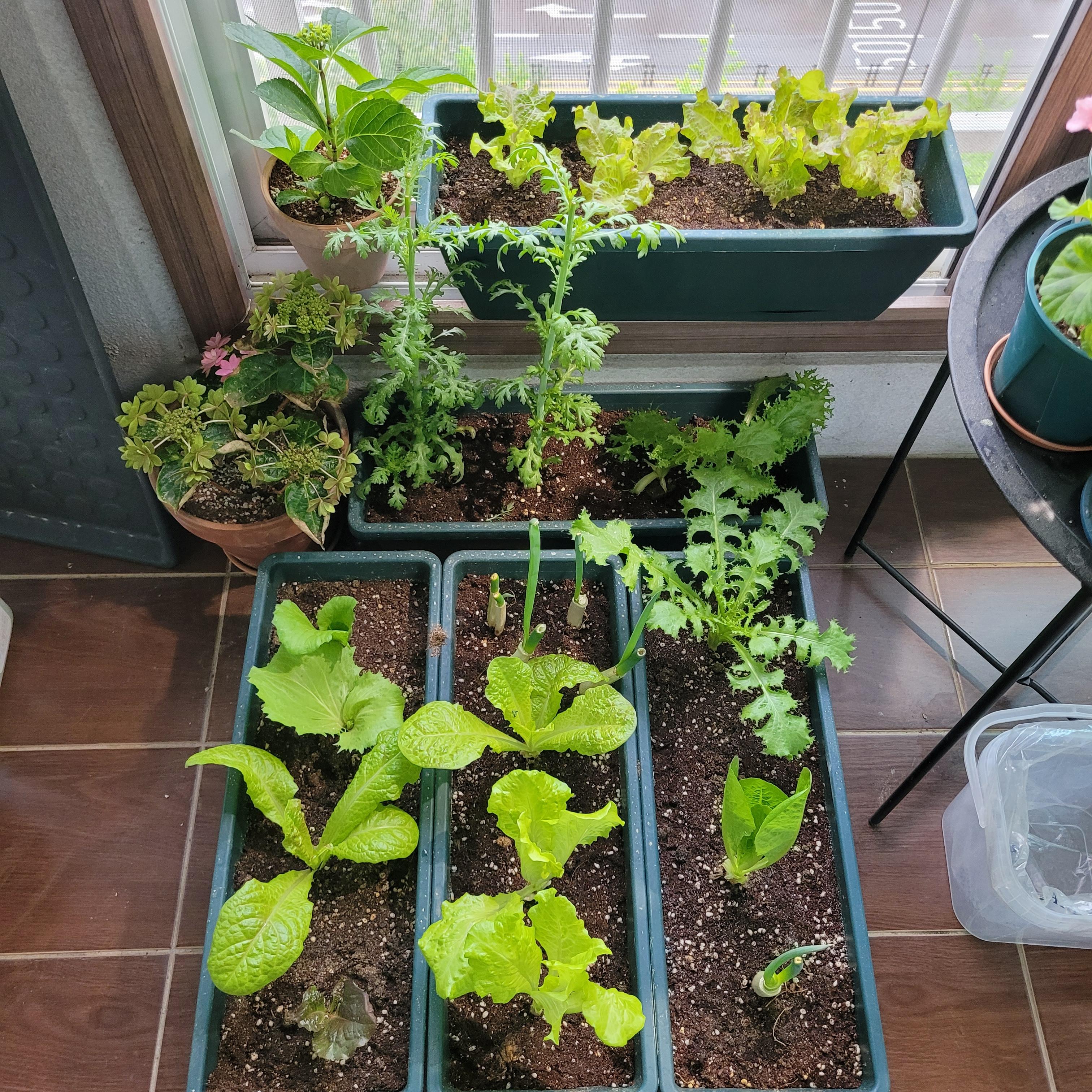 베란다에서 처음으로 가꾸는 텃밭에서 상추와 토마토등이 자라는 걸 보면서