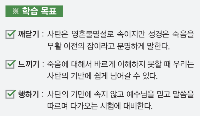 - 요한복음 11:11~14, 21~25, 디모데후서 1:10, 고린도전서 15:51~54, 데살로니가전서 4:15~17을 읽어 보라.