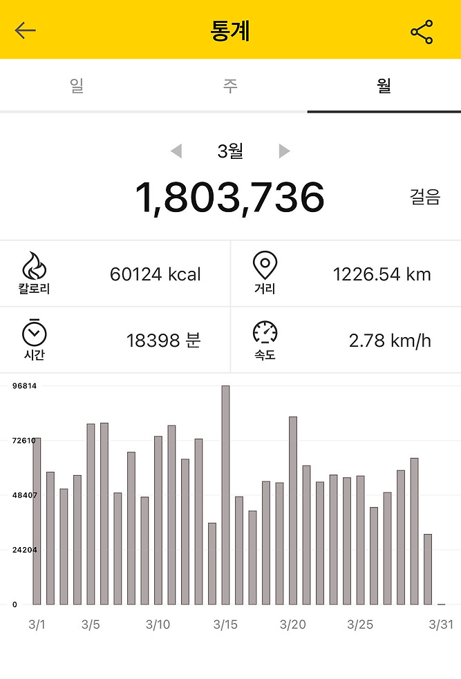 - 3월 가장 많이 걸은 날은 96,814보이다.